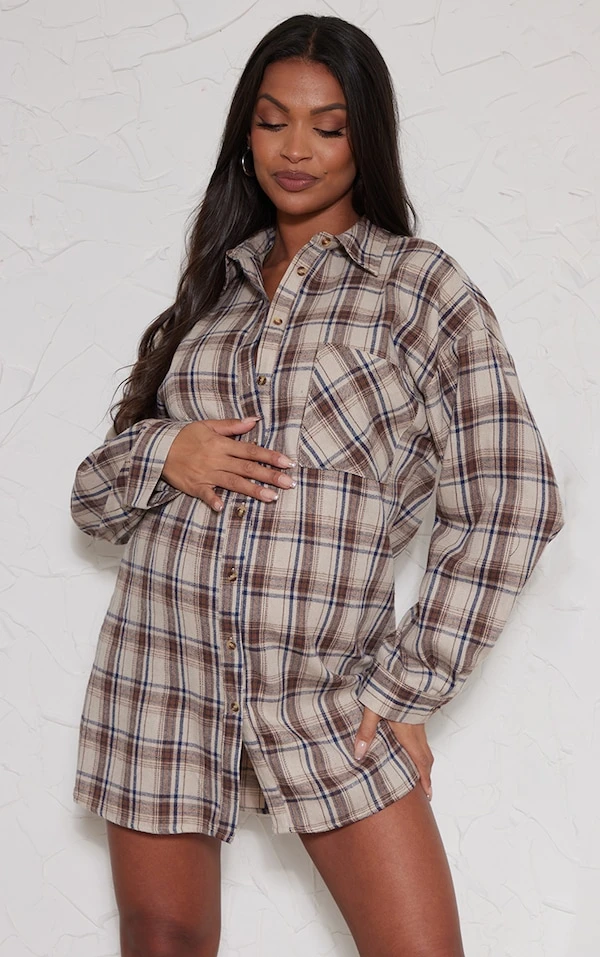 Maternité Robe chemise de grossesse brossée marron à carreaux en flannelle oversize à ourlet incurvé