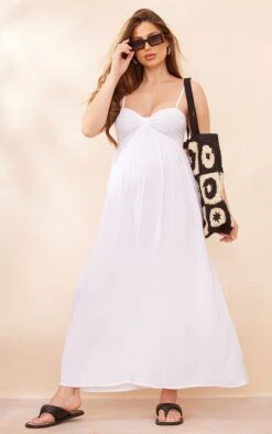 Maternité Robe de grossesse longue blanche en étamine à bretelles et détail bonnets