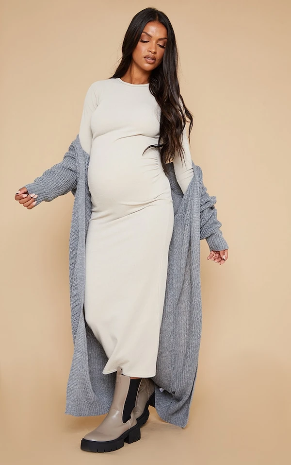 Simplissime cette robe de grossesse ! On adore sa matière côtelée super cosy pour votre ventre, son coloris gris pierre tout doux et son design à manches longues très glam. C’est à porter avec une paire de bottines et des créoles. Si simple !