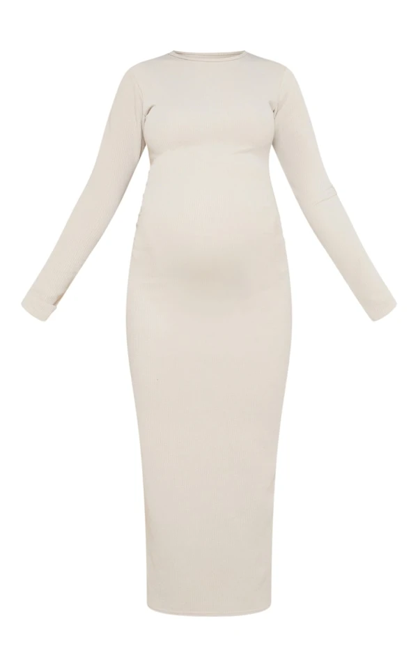 Maternité Robe de grossesse mi-longue côtelée gris pierre à manches longues