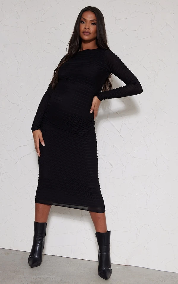 Maternité Robe de grossesse mi-longue froncée noire à manches longues