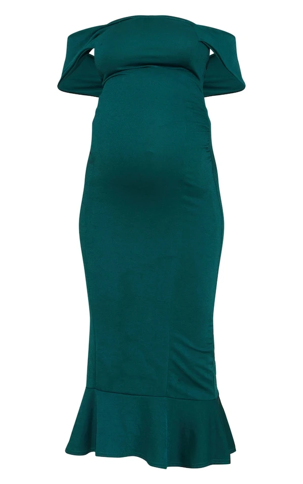 Maternité Robe de grossesse mi-longue vert émeraude à col bardot et ourlet volanté