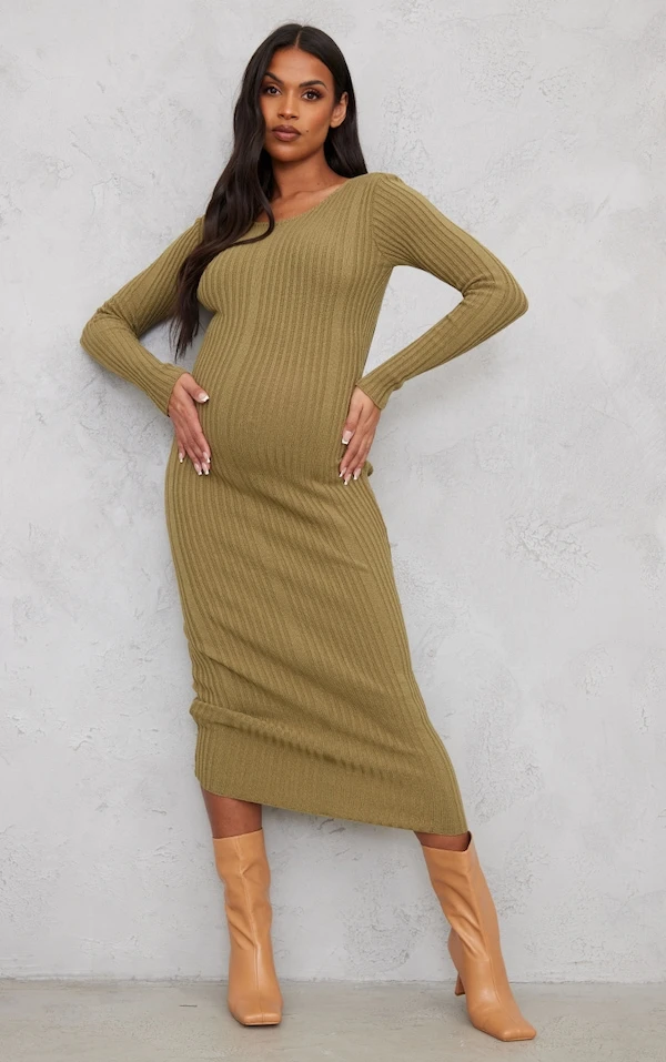 Maternité Robe moulante de grossesse longue en maille tricot kaki à nouer derrière
