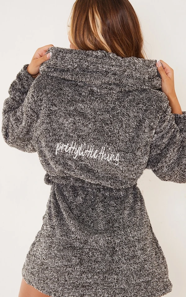 Shoppez ce peignoir ultra cosy pour rester comfy à la maison. Avec sa matière hyper fluffy gris anthracite, son logo PRETTYLITTLETHING brodé à l’arrière et sa capuche, on est fans. Portez-le sur votre pyj’ préféré et ajoutez une paire de chaussons fluffy pour un look de flemme complet! On profite un max de nos days off!