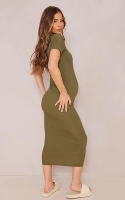 Maternité Robe De Grossesse Mi-longue Kaki Côtelée à Col Ras-du-cou