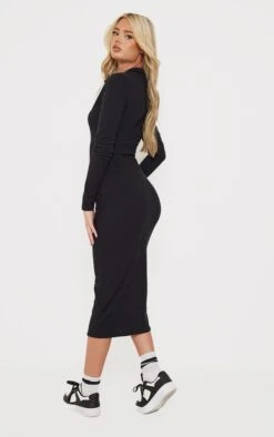 Maternité Robe De Grossesse Mi-longue Noire Crêpée Côtelée à Col Polo