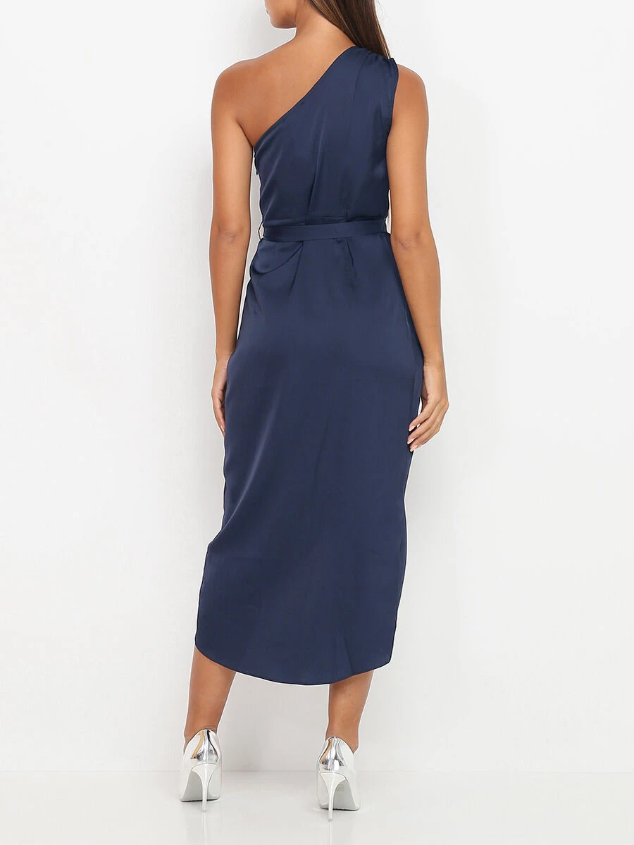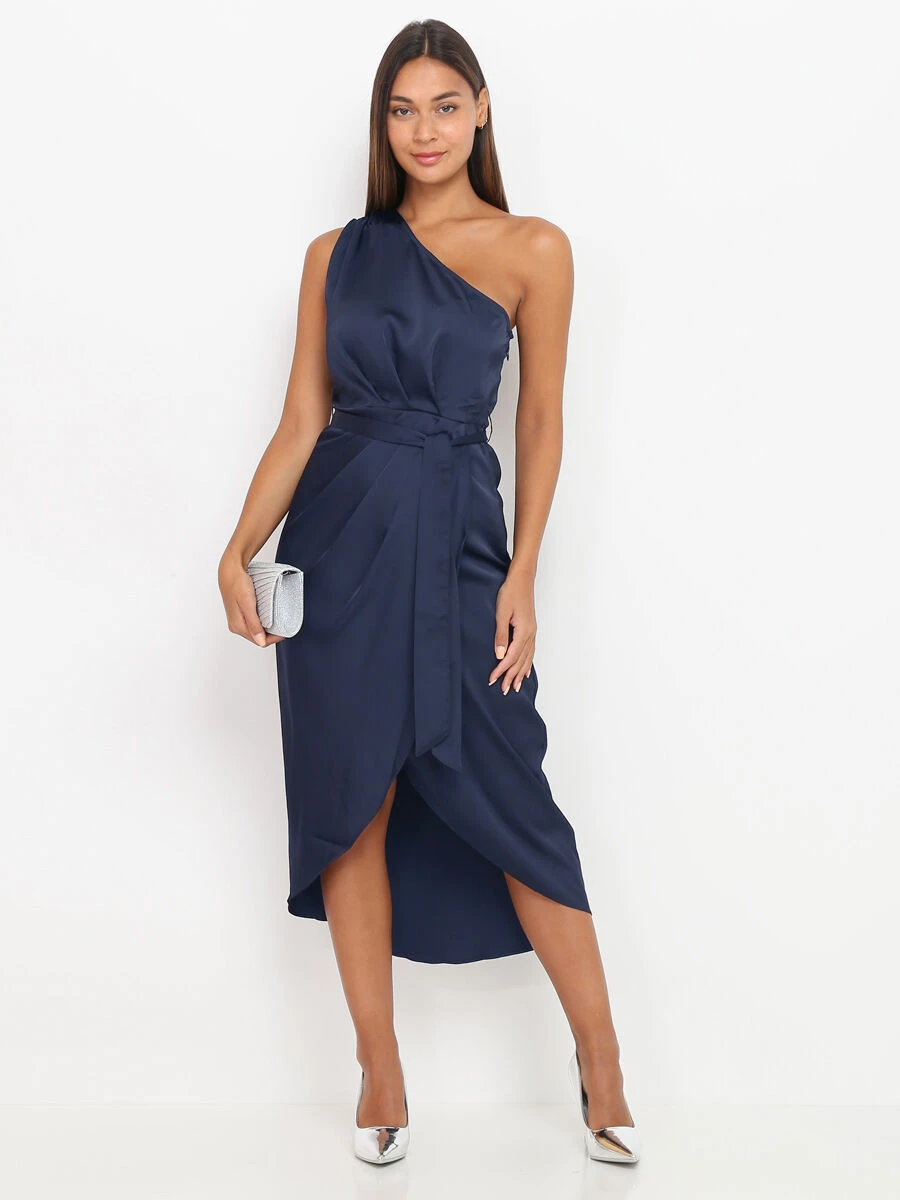 Robe portefeuille satinée aux épaules asymétriques.