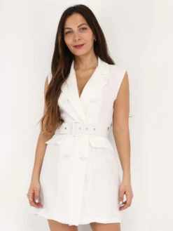 Robe blazer fendue et sans manches avec ceinture amovible.