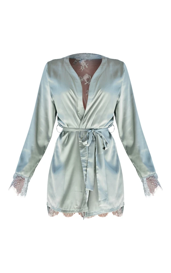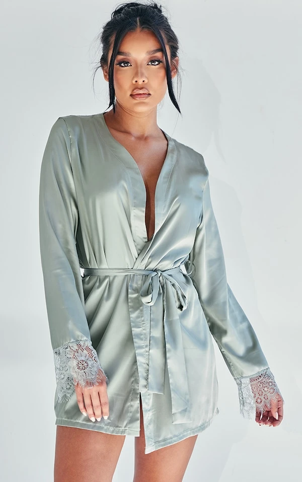 Robe de chambre satinée verte à dos et manchettes en dentelle