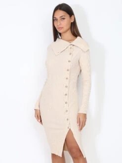 Robe moulante et fendue en maille boutonnée.