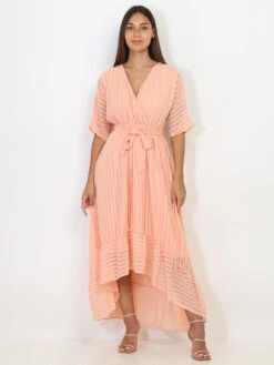 Robe longue asymétrique à rayures transparentes.