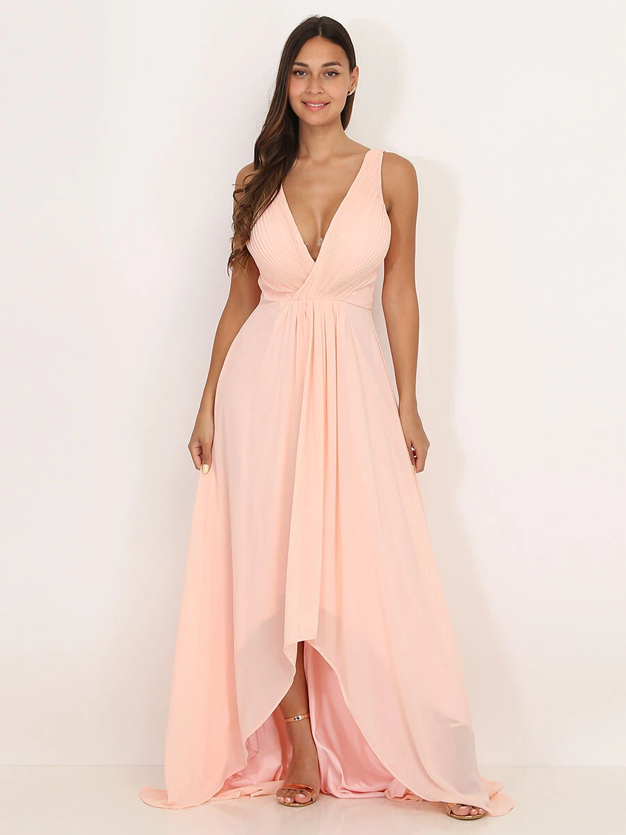 Modèle sans manches et effet drapé sur le buste en cache coeur.