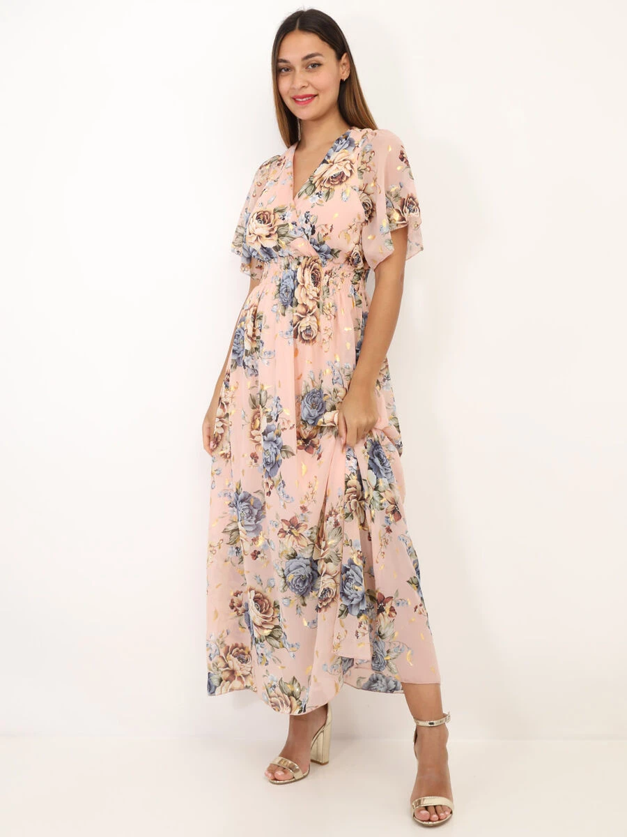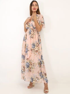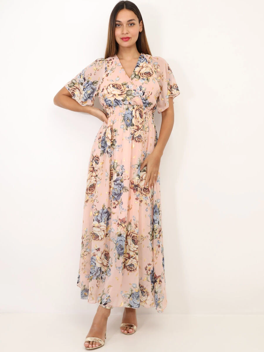 Dotée d’une encolure cache-coeur et d’une taille smockée.
