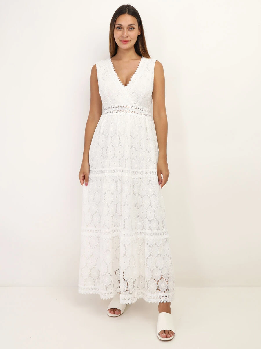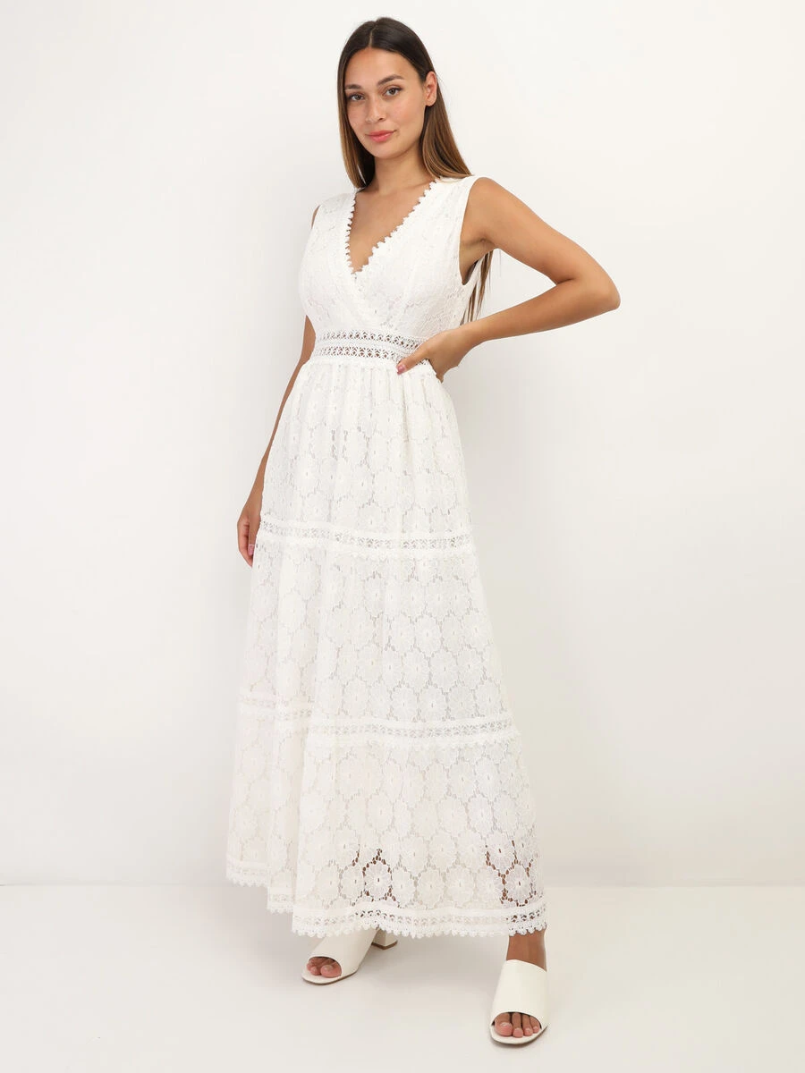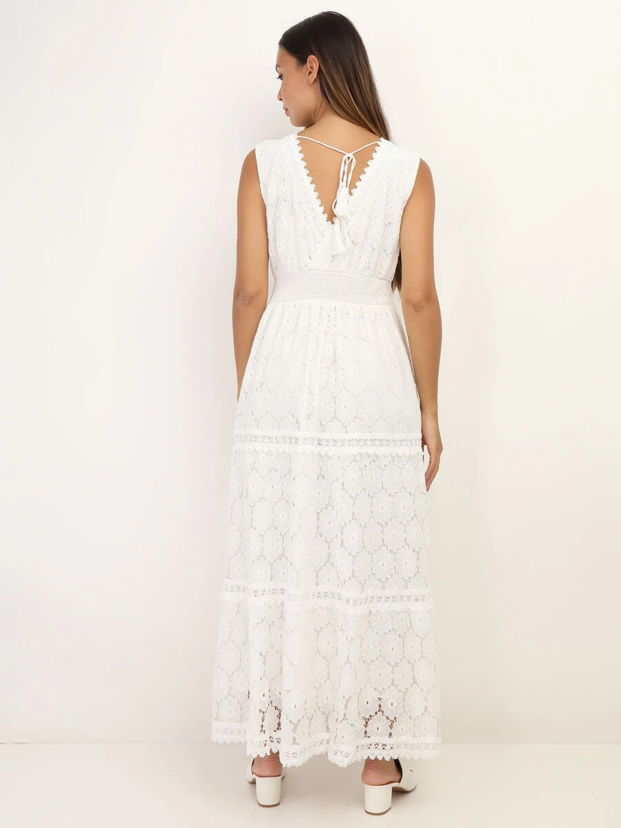 Robe longue et évasée avec dentelle à motif floral.