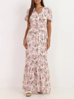 Robe longue à fleurs roses.