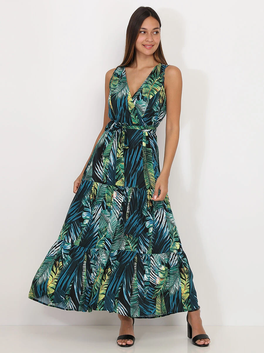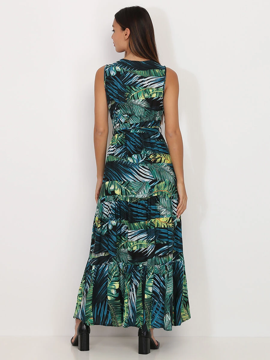 Robe longue patineuse à imprimé tropical vert.