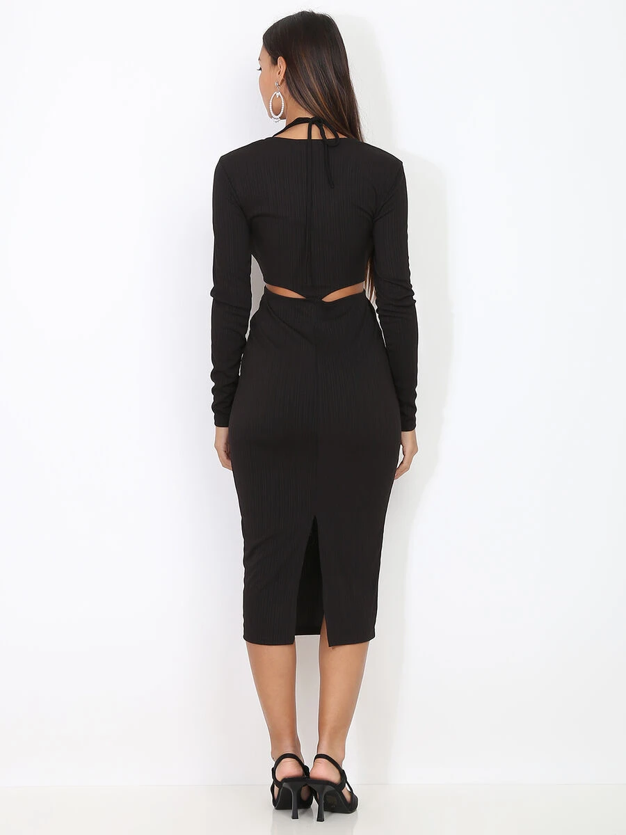 Robe longue cut out avec liens à nouer sur le décolleté. Effet plissé.