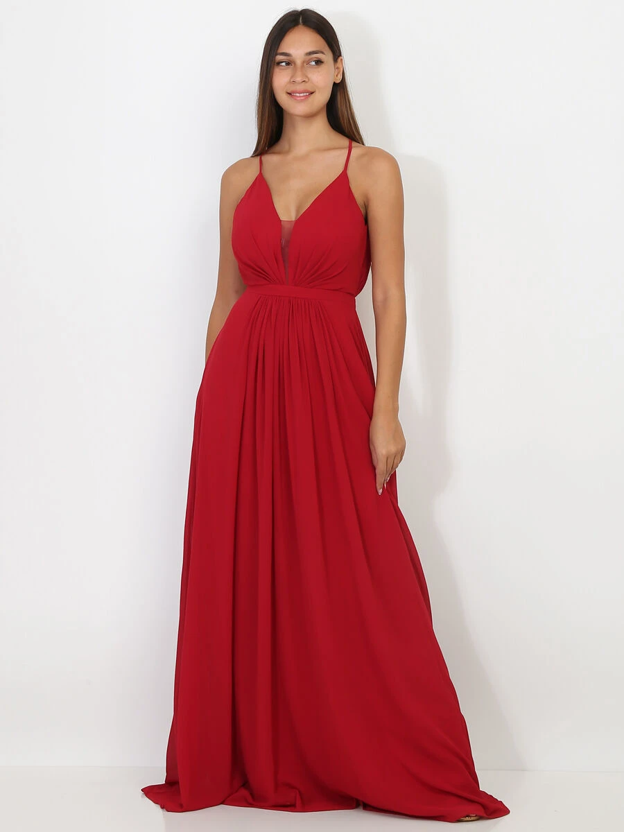 Modèle à bretelles réglables et col décolleté avec tulle.