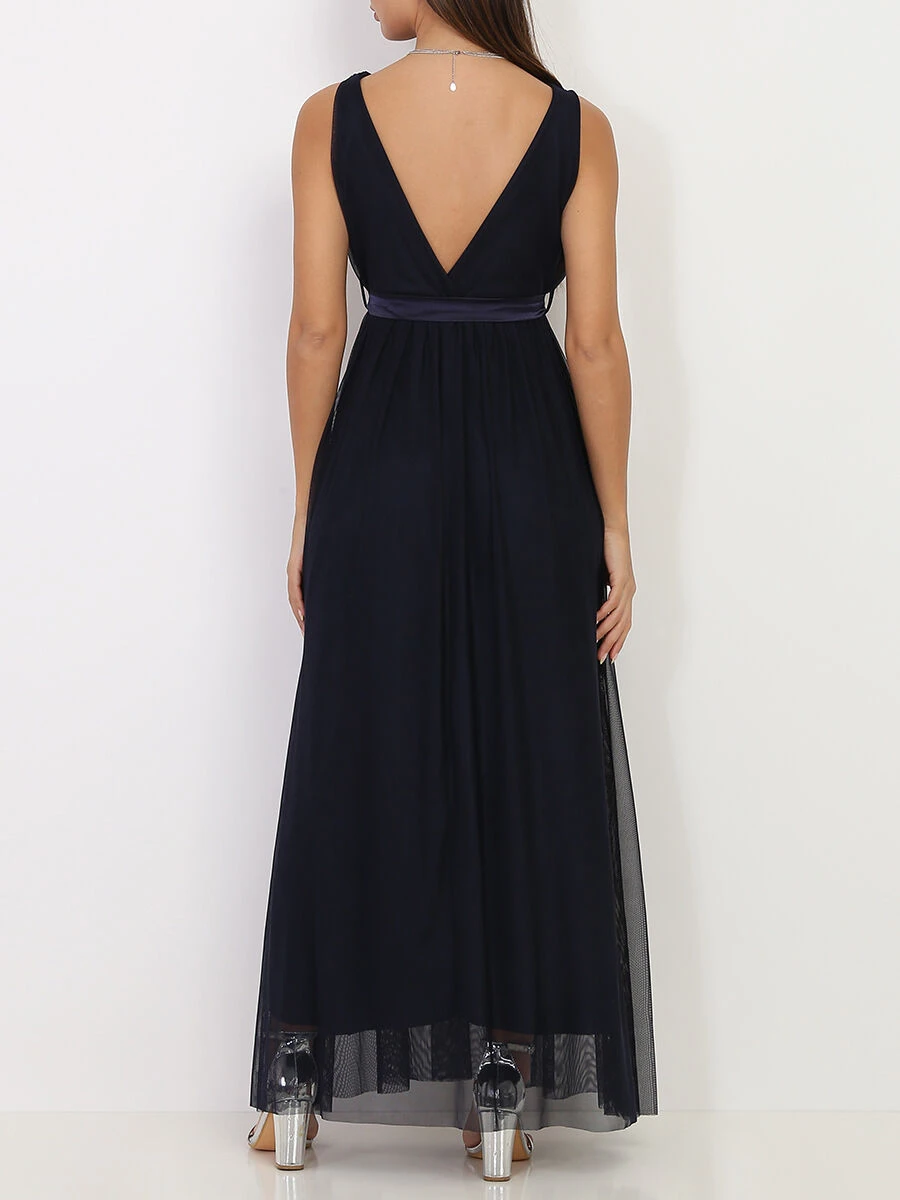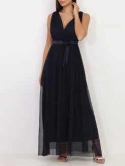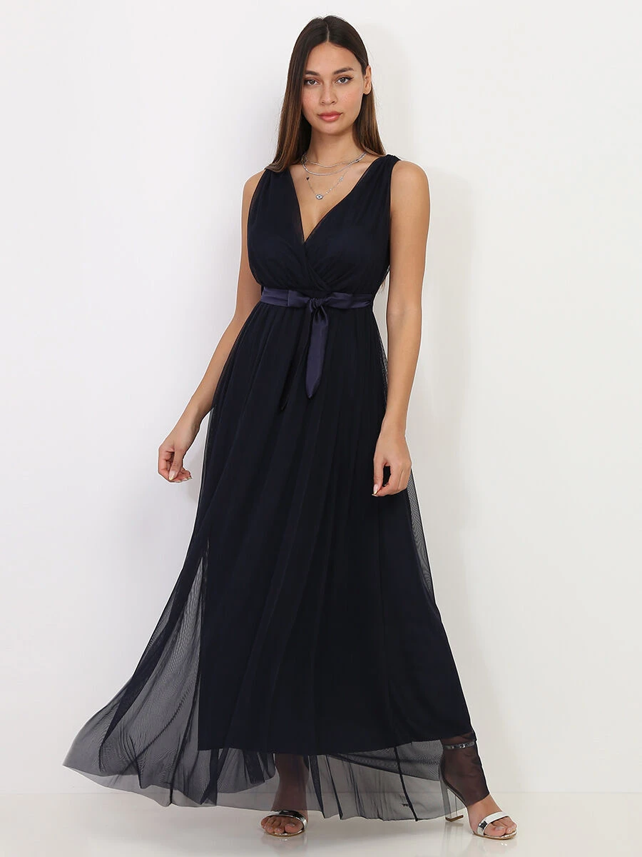 Robe longue en tulle avec une ceinture satinée à nouer.