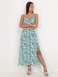 Robe longue style portefeuille avec motif feuilles en aquarelle.