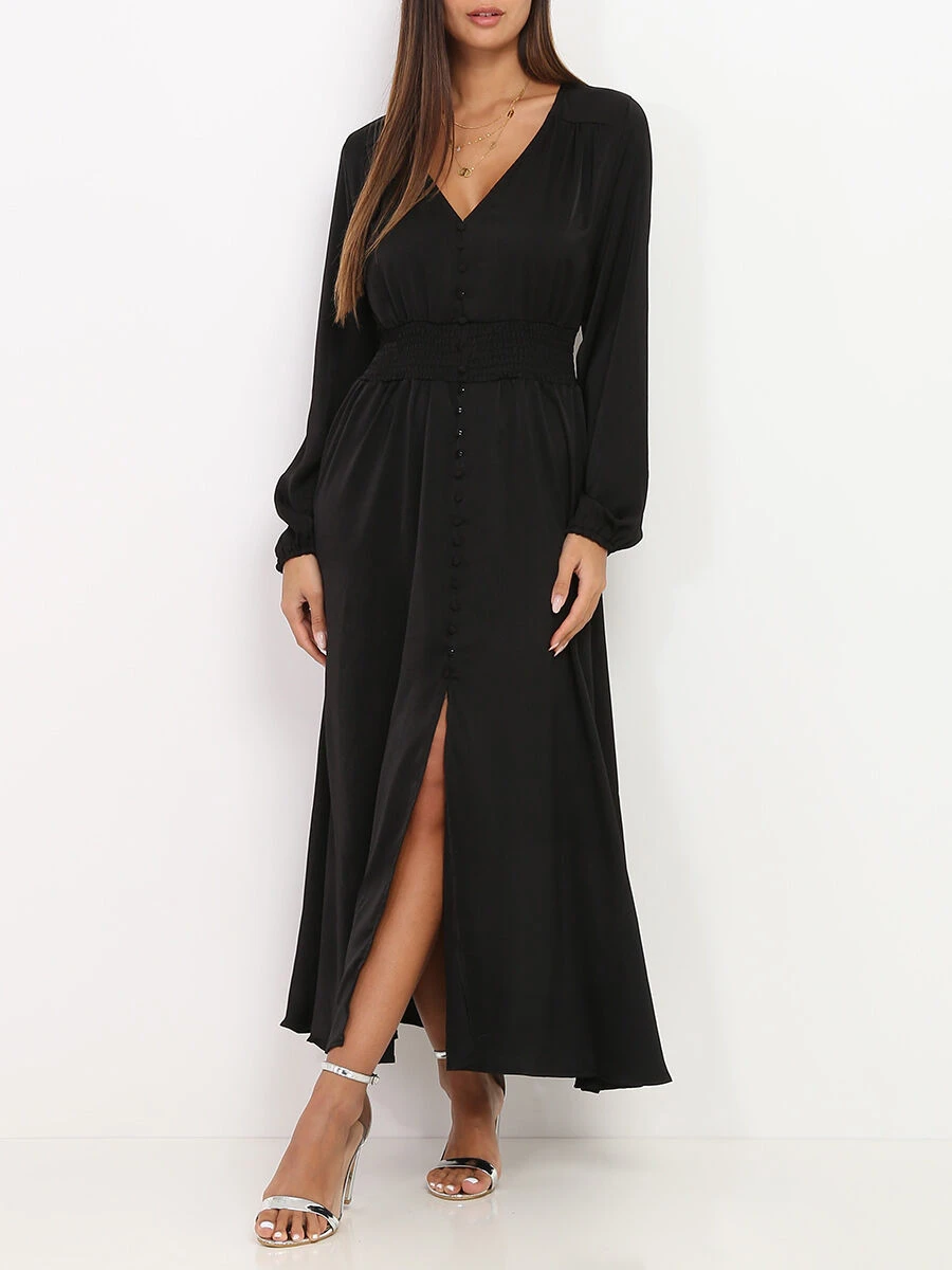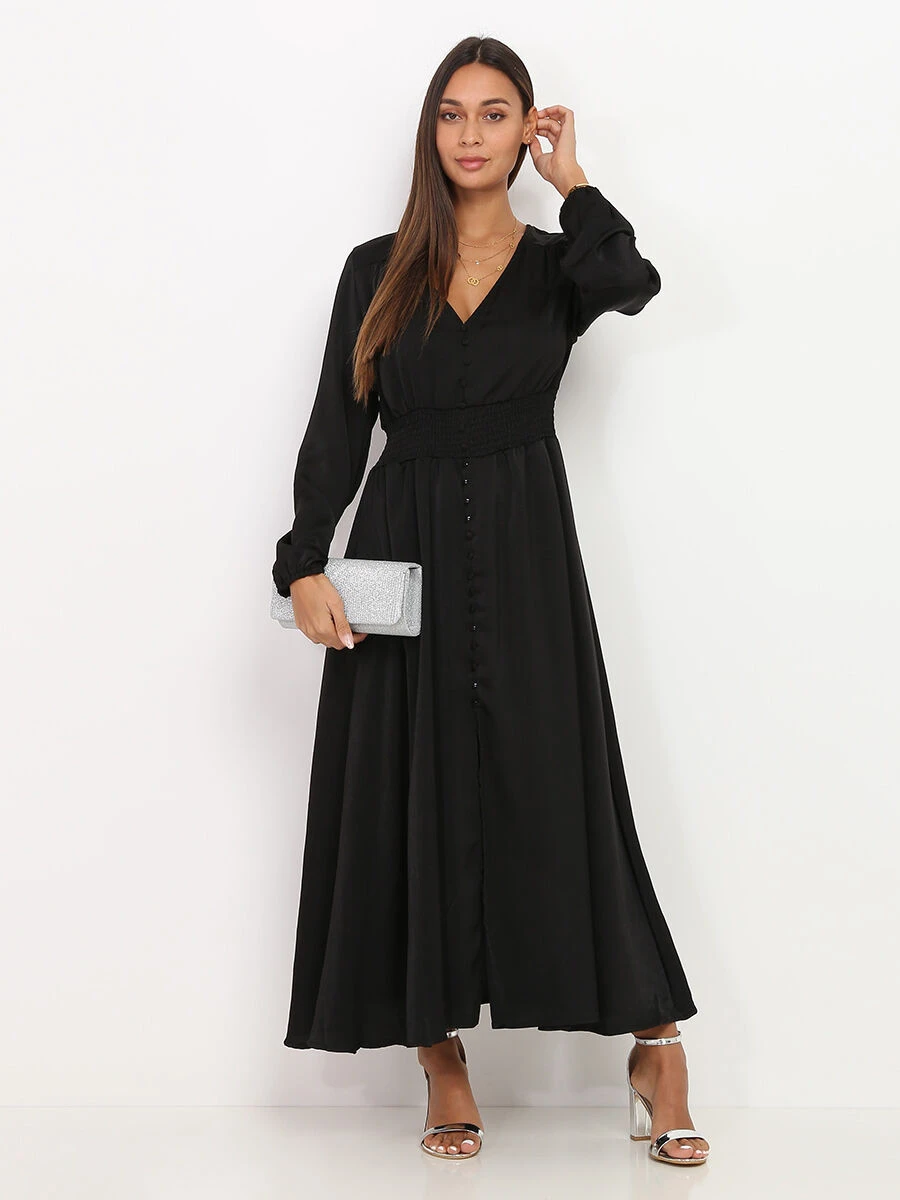 Robe longue patineuse satinée et smocké à la taille.