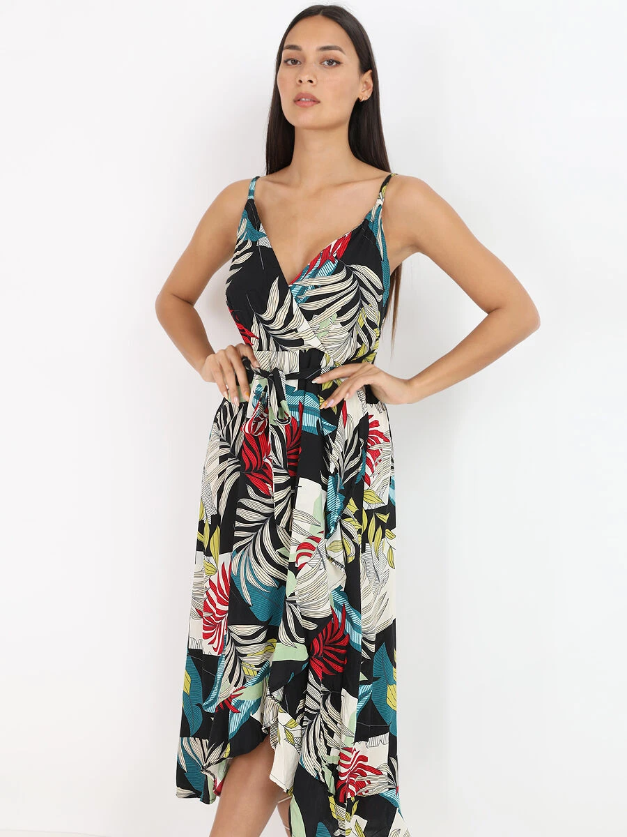 Robe mi-longue à feuilles tropicales et bretelles réglables.
