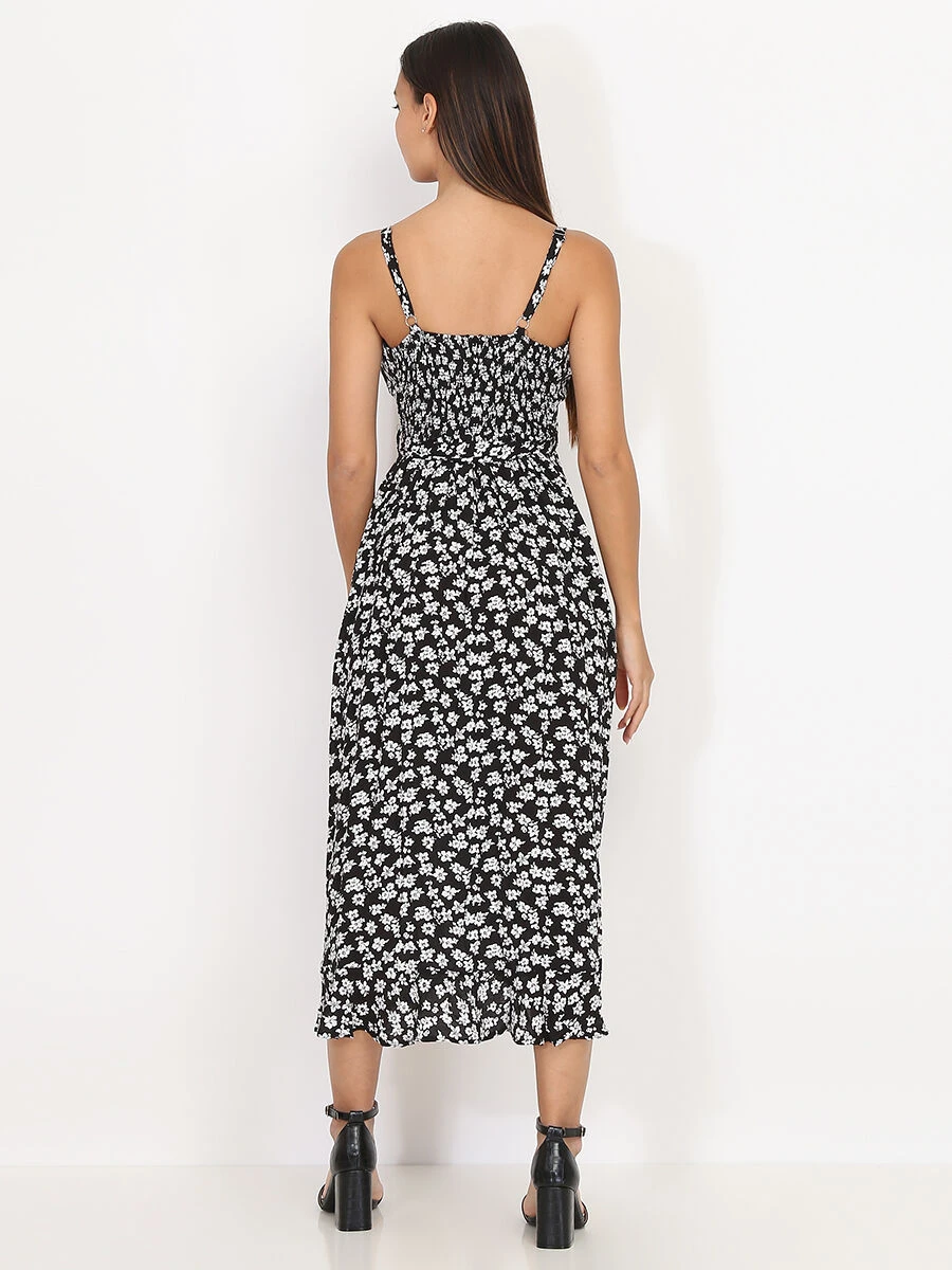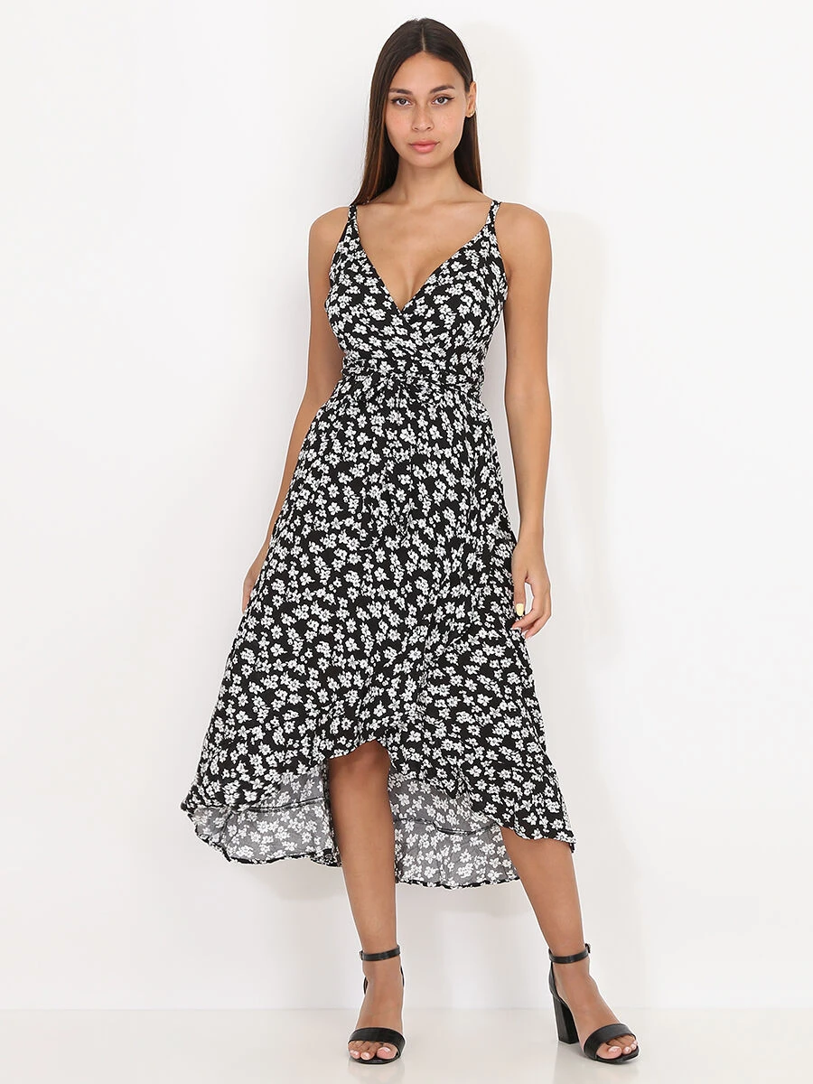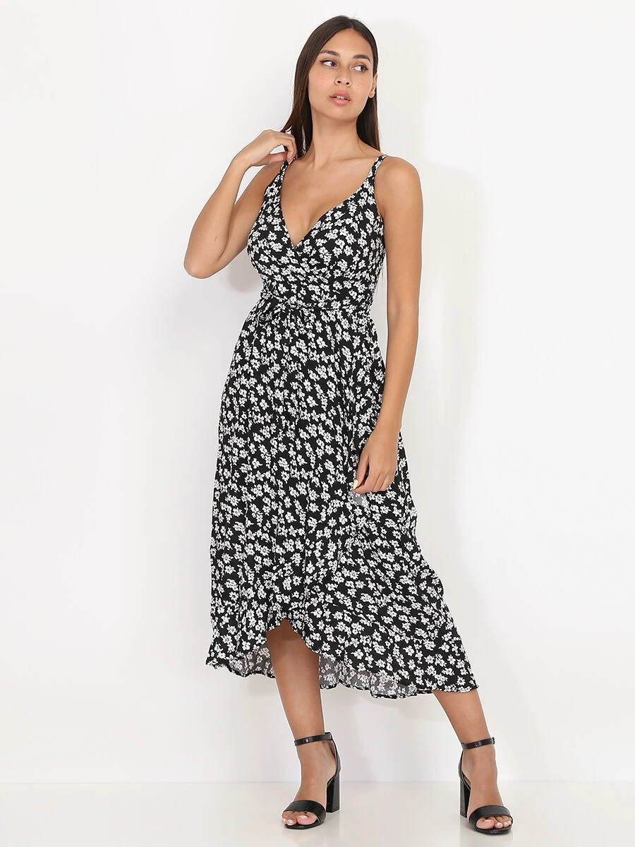 Robe fluide asymétrique à petites fleurs avec fines bretelles ajustables.