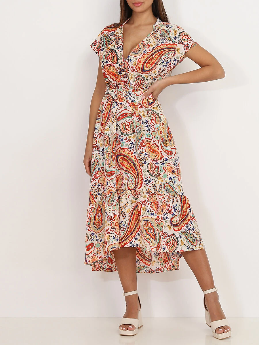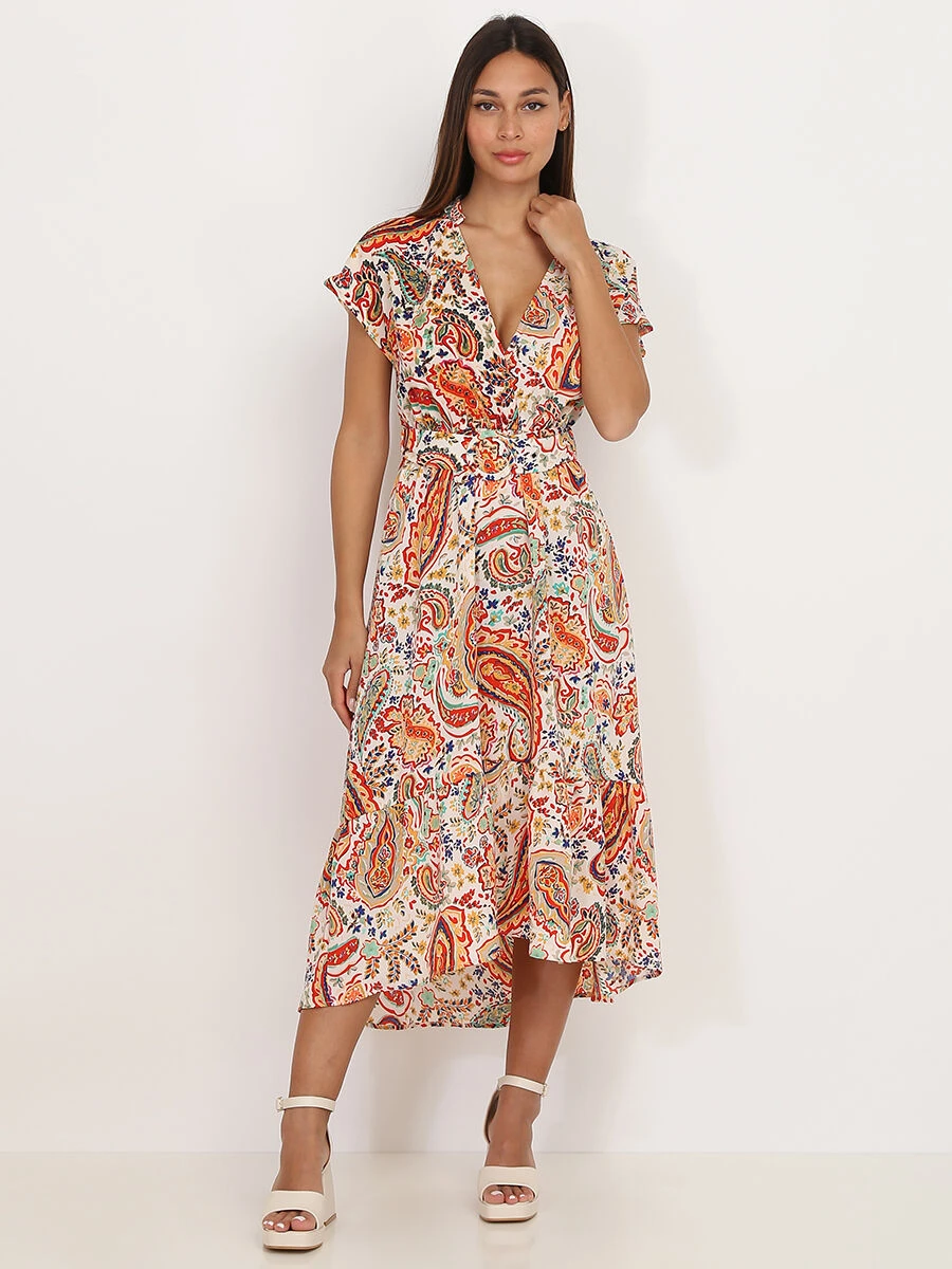 Robe mi-longue évasée à imprimé cachemire.