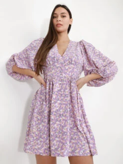 Robe patineuse à imprimé fleurs roses avec manches bouffantes.