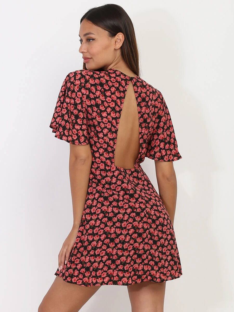 Robe courte patineuse en voile semi-transparent et à motif floral.