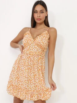 Présence de volants sur le buste, la taille et en bas de la robe.