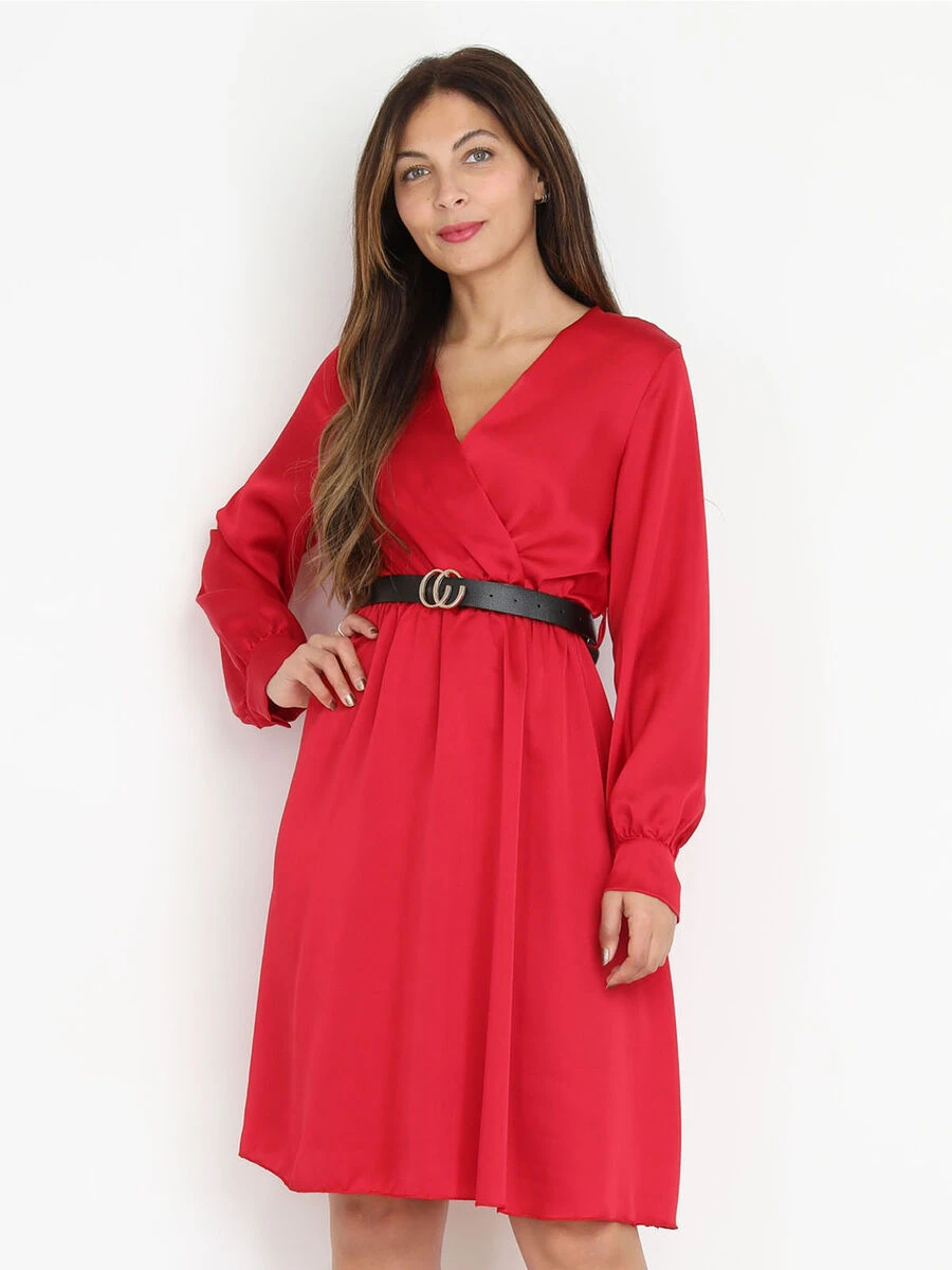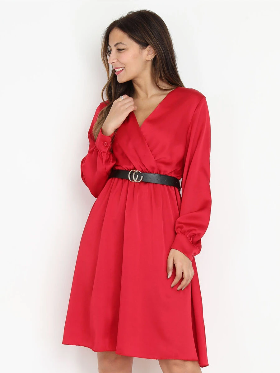 Robe patineuse satinée à ceinture en simili à boucle dorée.