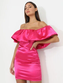 Robe satinée moulante à col bardot bouffant.