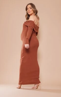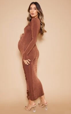 Maternité Robe De Grossesse Très Moulante Froncée En Acétate Chocolat à Détail Coutures