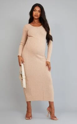 Maternité Robe Moulante De Grossesse Longue En Maille Tricot Avoine à Nouer Derrière