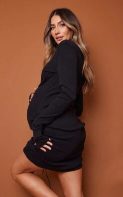 Zero Maternité Robe De Grossesse Moulante Noire Côtelée à Manches Longues Et Devant Froncé