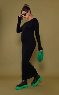 Maternité Robe Moulante De Grossesse Longue En Maille Tricot Noire à Nouer Derrière