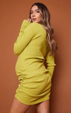 Zero Maternité Robe De Grossesse Moulante Chartreuse Côtelée à Manches Longues Et Devant Froncé